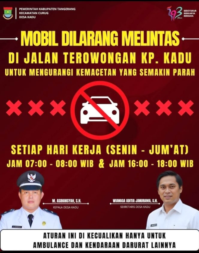 TANGERANG, Cybernewsnasional.com – Pemerintah Desa Kadu resmi memberlakukan aturan pembatasan kendaraan roda empat yang melintas di Jalan Terowongan Kampung Kadu pada jam-jam sibuk, yakni pagi dan sore hari. Kebijakan ini mulai efektif diterapkan pada Senin, 1 Desember 2025, sebagai langkah cepat dan solutif untuk mengurai kemacetan yang kerap terjadi saat jam berangkat dan pulang kerja.