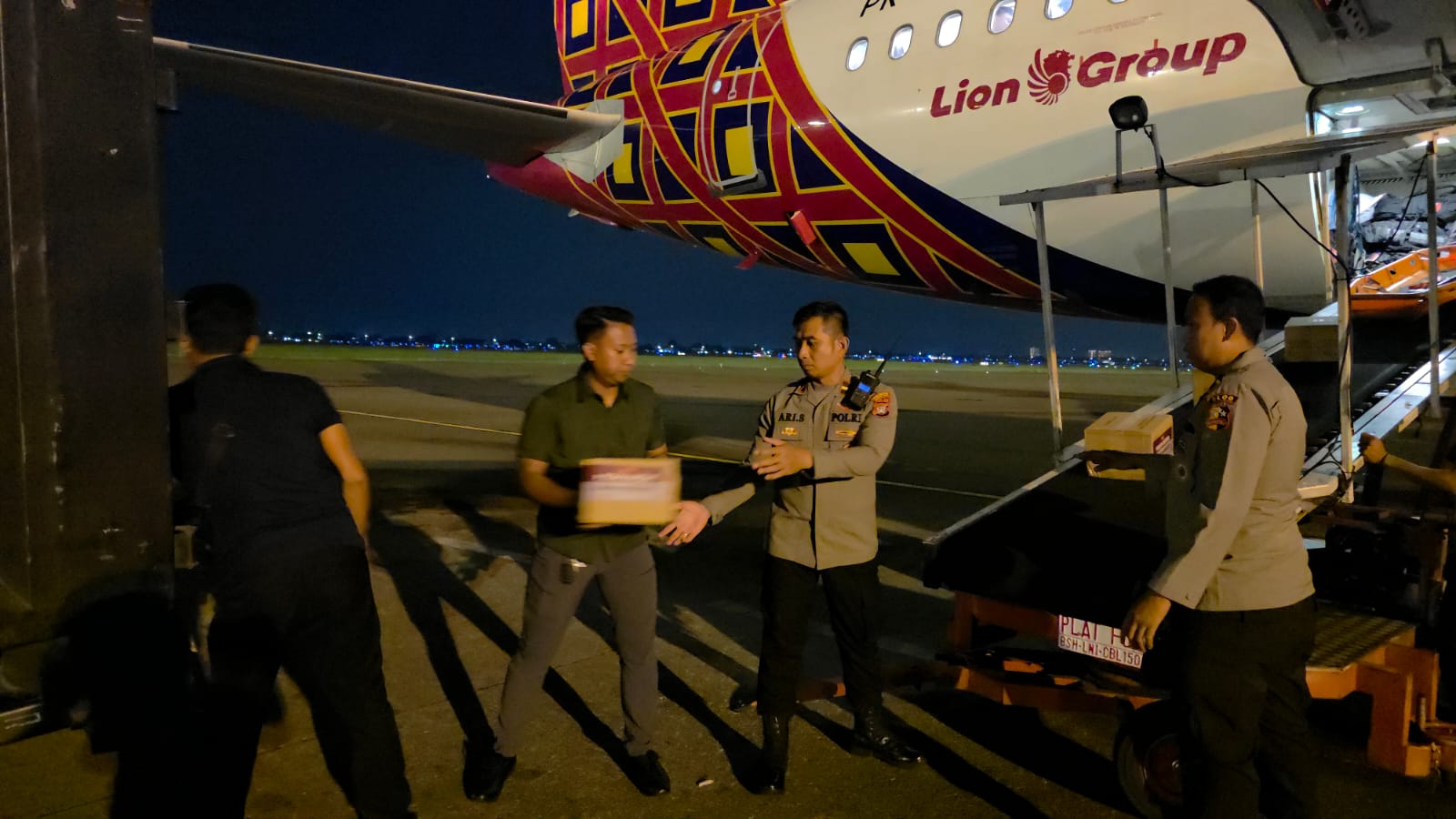 Pada pukul 22.20 WIB, logistik berupa makanan siap saji dan lampu penerangan telah memasuki pesawat Charter Flight Batik Air dengan nomor penerbangan ID8350.