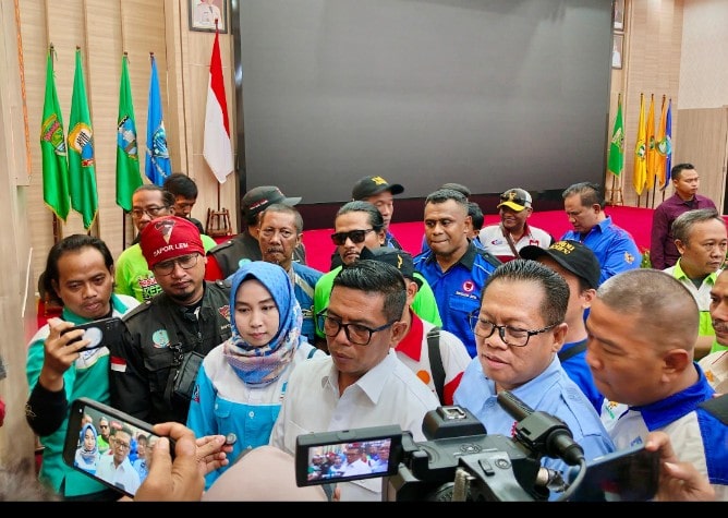 Gubernur Banten Andra Soni didampingi Dedi Sudarajat bersama pimpinan buruh se Banten saat diwawancara media.