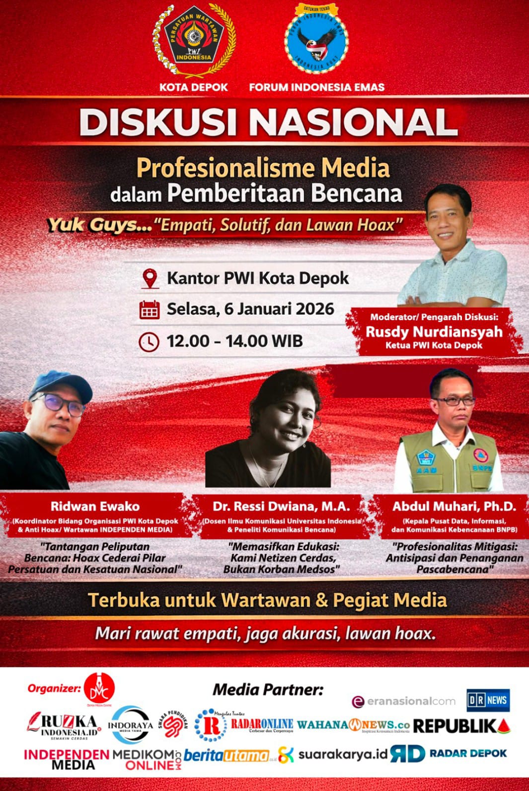 “Agenda diskusi nasional ini merupakan wujud kepedulian PWI Kota Depok terhadap krisis kemanusiaan yang bisa terjadi apabila antisipasi dan penanganan pascabencana tidak berjalan sebagaimana mestinya. Pemberitaan pers sangat menentukan kondisi tersebut, terutama dalam menangkal gelombang hoaks di media sosial,” ujar Rusdy kepada wartawan di Depok, Sabtu (3/1/2026).