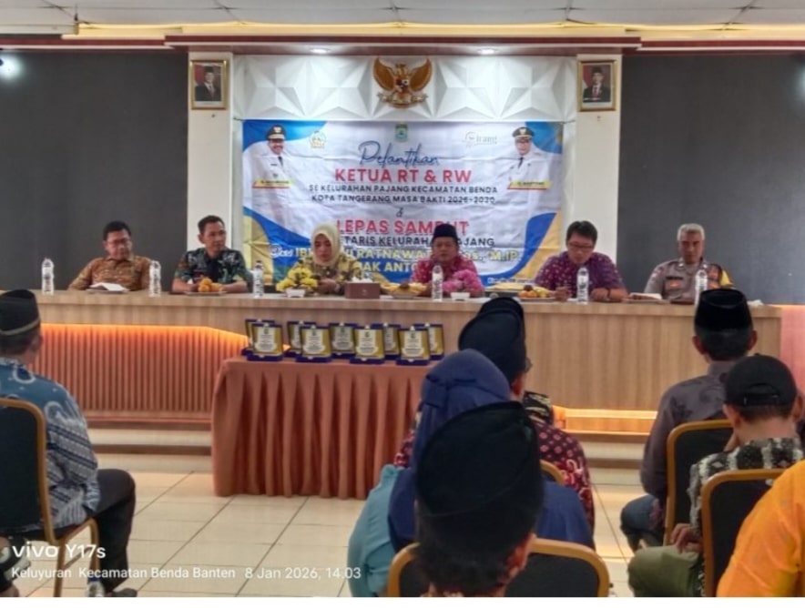 KOTA TANGERANG, Cybernewsnasional.com – Kelurahan Pajang secara resmi melantik Ketua RT dan RW se-Kelurahan Pajang dalam sebuah acara yang berlangsung khidmat dan tertib. Kegiatan ini dirangkaikan dengan acara lepas sambut Sekretaris Kelurahan (Sekel) lama Dewi Ratnawati kepada Sekretaris Kelurahan yang baru Anton Patoni, bertempat di aula Kelurahan Pajang, Jalan Gelora Raya, Kelurahan Pajang, Kecamatan Benda, Kota Tangerang, Kamis (8/1/2026).