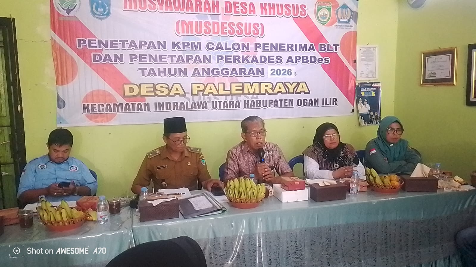 Rangkaian kegiatan tersebut meliputi Musyawarah Desa Khusus (Musdesus) penetapan Keluarga Penerima Manfaat (KPM) Bantuan Langsung Tunai Dana Desa (BLT DD) Tahun 2026, layanan cek kesehatan gratis oleh Puskesmas Palemraya bekerja sama dengan Dinas Kesehatan Kabupaten Ogan Ilir, serta pembagian Makan Bergizi Gratis (MBG) bagi masyarakat.