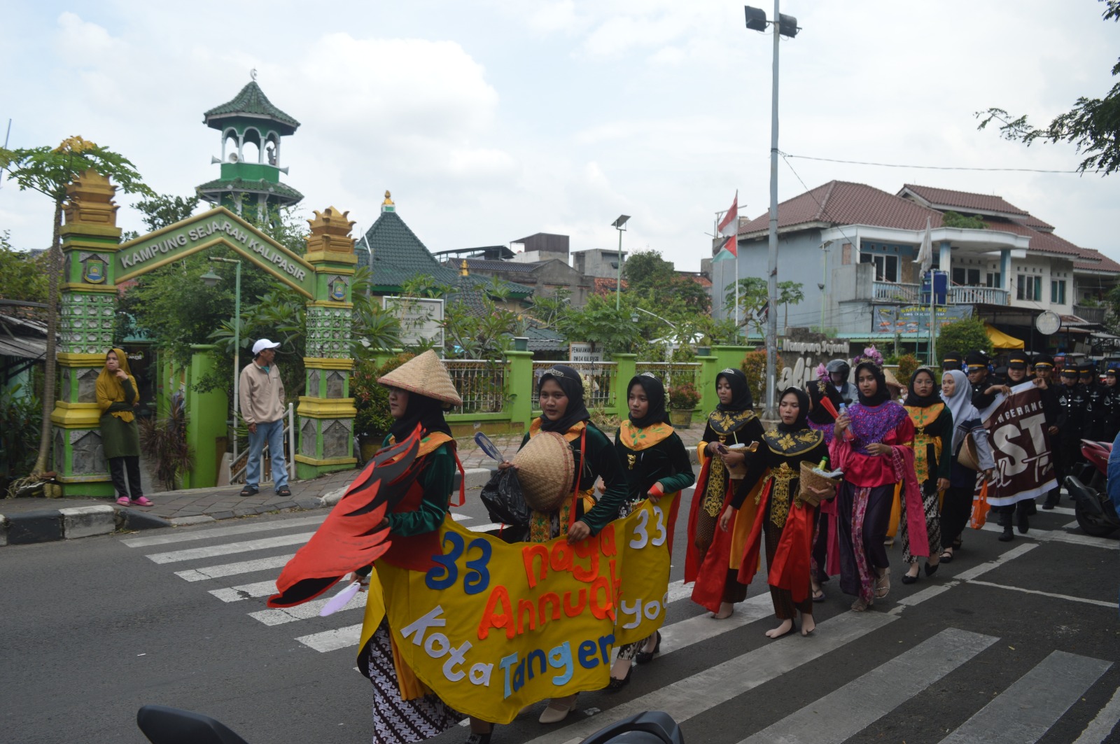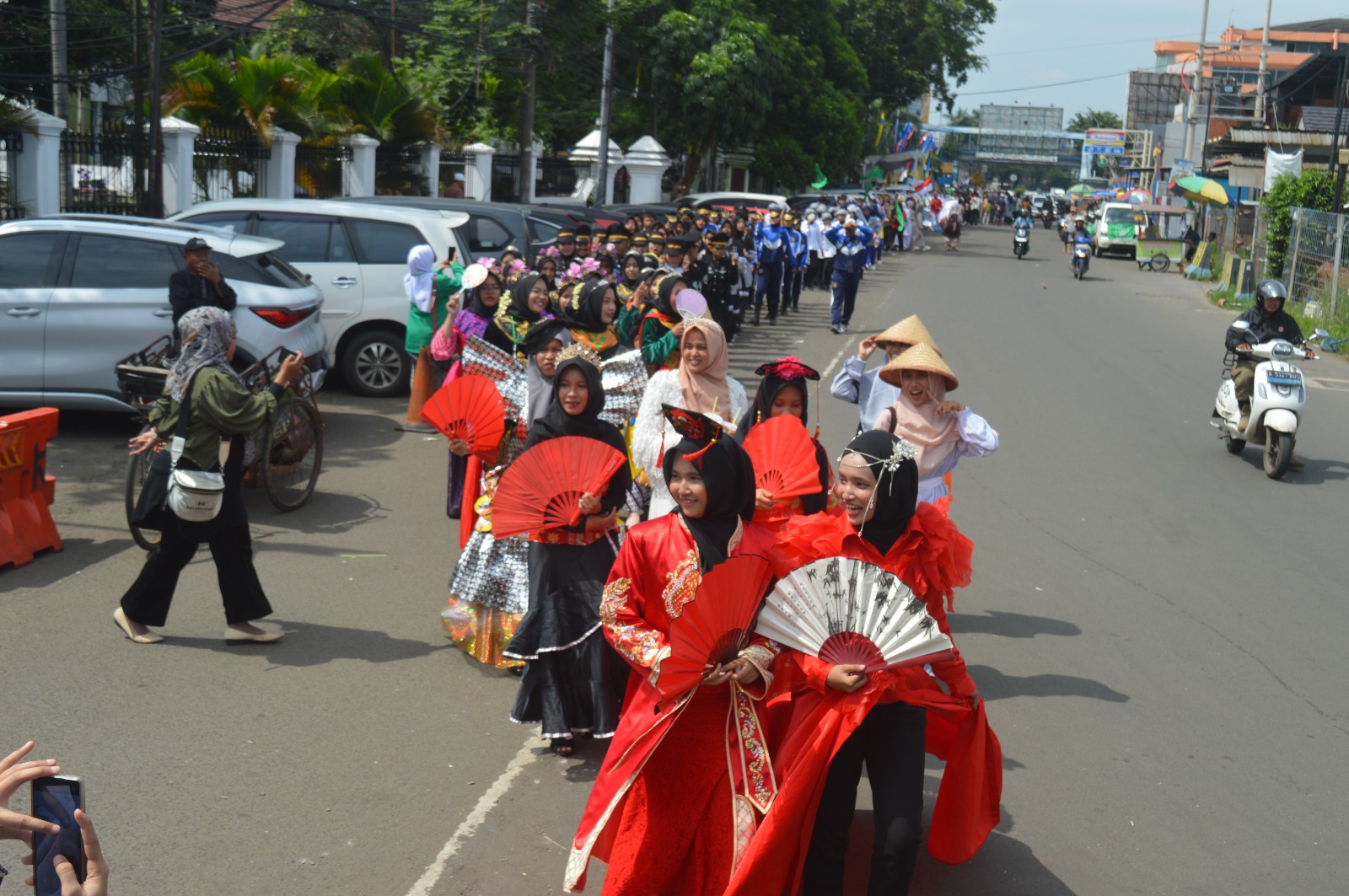 Ribuan peserta memadati kawasan ikonik Jalan Kisamaun di pusat kuliner Pasar Lama. Dari sekian banyak rombongan, penampilan santriwati dari Pondok Pesantren An-Nuqtoh mencuri perhatian. Kolaborasi kostum yang dikenakan tampil berbeda dan semarak, mulai dari busana berbahan daur ulang sampah plastik hingga nuansa pecinan dengan dominasi warna merah yang mencolok.