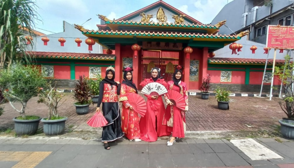 Saat melintasi rute karnaval di sepanjang Jalan Kisamaun-Jalan Kali Pasir, rombongan Ponpes An-Nuqtoh juga memanfaatkan momen untuk berfoto di depan salah satu klenteng yang berada di jalur karnaval. Konsep perpaduan kostum budaya dan aksesori pecinan Tionghoa tampak serasi dikenakan para santriwati berhijab tersebut.