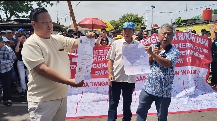 JAKARTA.Cybernewsnasional.com-Warga RW 017 Kelurahan Kalideres, Kecamatan Kalideres, Jakarta Barat kembali menggelar aksi unjuk rasa menolak pembangunan rumah duka dan krematorium Swarga Abadi di Jalan Utan Jati, Sabtu (28/2/2026).