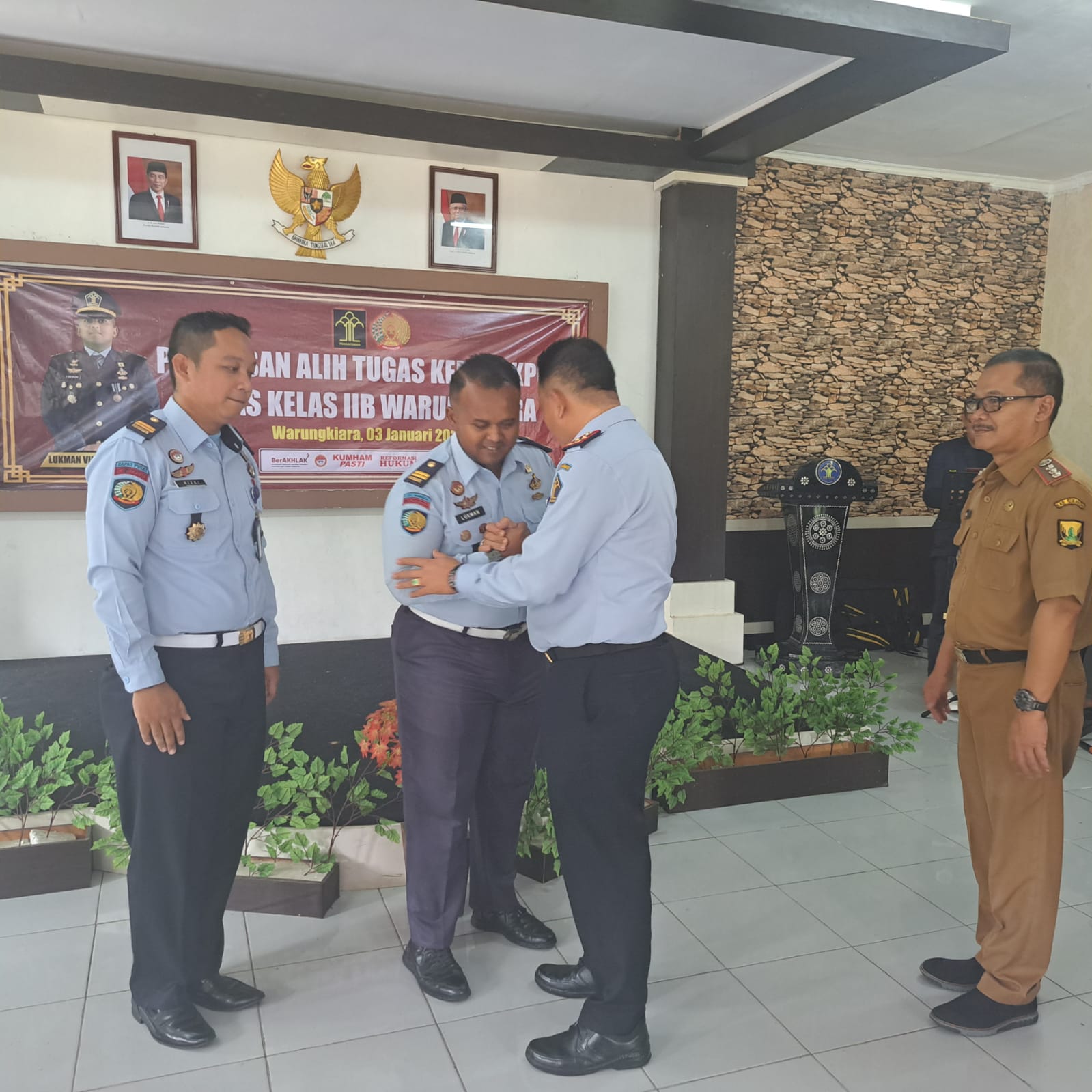 Acara dilaksanakan di Aula Gedung I Lapas Warungkiara dalam suasana pagi yang cerah seakan memberi semangat pengantar tugas di tempat yang baru untuk Ka. KPLP yang lama, Lukman Viky.