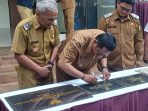 SUKABUMI, Cybernewsnasional.com – Kepala Dinas Perumahan dan Permukiman (Perkim), Sendi Apriadi bersama Kepala Inspektorat Kabupaten Sukabumi, H. Komarudin dampingi Bupati Sukabumi H
